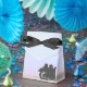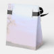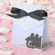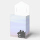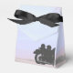 A motorcycle with two helmets sits against a dusky sunset background on this biker couple wedding favor box.