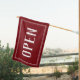 Modern minimalist weatherproof "open" sign with stylish typography on a dark red background for a business. Perfect to let customers know when your business is open. Great for small businesses, bakery, salon, cafe, restaurant, shop, boutique.