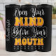 This image features an impactful phrase, "Open Your Mind Before Your Mouth," rendered in a stylish font against a light gray background. The words "MIND" and "MOUTH" are highlighted in a prominent orange with a white border, while "Open Your" and "Before Your" appear in a delicate white script. Small diamond shapes form a border at the bottom, adding a subtle decorative touch.