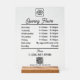 A black script opening business hours acrylic sign featuring business logo, QR Code, your custom social media icons and contact details. A personalized shop hours clear acrylic sign perfect for shop tabletops. Perfect for a business shop owner who would like to notify their customers about its opening hours.