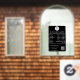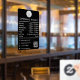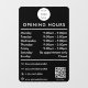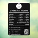A black opening business hours window decal and window cling featuring business logo, QR Code, your custom social media icons and contact details. A personalized shop hours window cling perfect for shop windows and front door signs. Perfect for a business shop owner who would like to notify their customers about its opening hours.