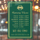 Display your business hours to clients and customers with this stylish window cling. A vintage-inspired design featuring classic typography and a simple art deco border. This professional template is personalized with your company logo, opening times, telephone number, and website. It offers fully customizable text to fit your business brand. You can also change the background color by using the design editor tool. This adaptable design is ideal for a variety of establishments, stores, offices or services, including restaurants, cafes, salons, boutiques, dry cleaning services, and more! Printed colors: dark green and gold color. If you’d like your logo to coordinate with the gold type color, the Hex color code is #DEBE79