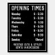 For wall-mounting - an Opening Times foam-board display for a shop. Alter details as you wish. Displays up to 7 days and opening hours. Black and white.