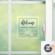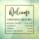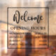 Square, opening hours window cling featuring the text "welcome" in an elegant calligraphy script font and your opening hours. Black text on a transparent background.