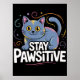 This cheerful graphic features a cute, blue cartoon cat with subtle yellow and pink highlights, gazing forward with bright yellow eyes and a content expression. Swirling, colorful lines in pink, yellow, and orange frame the feline. The bold white text at the bottom delivers an uplifting message: "STAY PAWSITIVE," playing on words with a paw print integrated into the 'A'. The design is set against a solid black background. Digital download for personal use only.