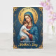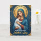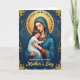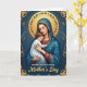 This card shows a motherly figure gently holding a calm child close against a deep blue background, their faces angled inward with a tender, protective closeness ❤️. They sit centered within an ornate rectangular border, creating a quiet, intimate scene that feels like a shared moment of trust. The woman wears flowing blue robes with small golden star-like accents and detailed edging over a deep red garment peeking through at the neckline and sleeves. A round golden halo with delicate symbol-like patterns circles her head, and her eyes are closed as if savoring the child’s peaceful presence. The child is dressed in soft white, resting comfortably with relaxed features, adding to the sense of warmth and closeness between them. Gentle golden light falls across their cheeks and the layered folds of fabric, with a faint rosy blush that makes the embrace feel affectionate and human 🌼. The words “Mother’s Day” appear in gold lettering near the bottom, standing out clearly against the darker tones. Around the scene, fine gold filigree and abstract motifs decorate the deep blue frame, with curling details at the corners and along the edges.