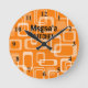 Orange 60's retro mod pattern kitchen wall clock design with numbers and custom name. Fun vintage print for kitchen, business, shop, company etc. Add your own custom name, monogram initial letters, inspirational quote, fun saying, quotation etc. Cool wall decoration for waiting room, school, home, office, job, work etc. Custom home decor with personalized text. Available in small and large size. Customizable colors.