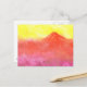 Bright and vivid landscape mountain volcano abstract painting. Bright yellow sky, misty orange mountain volcano landscape with pink lands in the foreground.