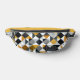 This smart fanny pack features a geometrical pattern of squares and triangles in orange, black and white.