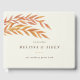 A lovely keepsake for the newly weds, this beautifully custom guestbook is easily personalized with names and dates, and features a gentle arch of leafy branches in warm autumnal hues of orange and red.