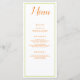 An orange and green fall inspired design, this wedding reception menu features a lovely white background with orange font. Featuring "Menu" written at the top using cursive orange font, all of your information is printed in orange readable font on a white background. Customize as you choose.