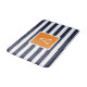 Custom monogrammed bath mat with a preppy stripe pattern in navy blue, orange and white colors. Personalize it with your monogram initial in a square frame. Use the design tools to choose any background colors, edit the text fonts and colors and add your own photos to create a one of a kind design to match any bathroom decor.