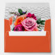 Bold orange with bright and colorful roses. Artistic wire element adds a touch of whimsy, as well as ribbon element on front right of envelope.