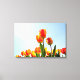 Canvas print with flowers consisting of orange and red tulips seen from a low point of view against a blue sky.