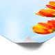 Photo print of flowers consisting of orange and red tulips seen from a low point of view against a blue sky.