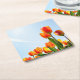 Coaster with flowers consisting of orange and red tulips seen from a low point of view against a blue sky.