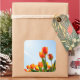 Photo sticker with flowers consisting of orange and red tulips seen from a low point of view against a blue sky.