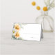 A orange and white daisies wedding table place card that includes the bride and groom's names along with their wedding date.