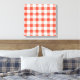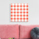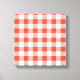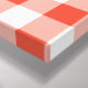 Reddish orange, light orange, and white squares form a bold, buffalo plaid or gingham pattern in this design.