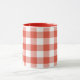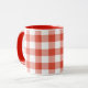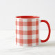 Reddish orange, light orange, and white squares form a bold, buffalo plaid or gingham pattern in this design.