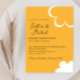 This wedding invitation features a retro, 1970s inspired theme. The background is an orange color, with brown text and the names of the couple printed in an elegant script font. A white, 70s style flower is printed in the bottom right, with a matching flower outline at the top.