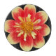Chop and dice your food safely on this decorative, round glass cutting board that features the photo image of an orange and yellow Collarette Dahlia bloom on a black background. A lovely, floral design!