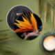 Round, magnetic bottle opener that features the photo image of an orange bloom of the tropical Bird of Paradise Plant printed on a black background along with the word ALOHA printed in light pink, stylized lettering. Also referred to a a Crane Flower. A lovely, floral design!
