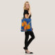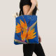 Wedding tote bag with orange bird of paradise design. Dark, navy blue color with bright orange flowers and text near the bottom on one side. Add the location of the event with date, or any other text that fits the area. Give to the parents, or wedding guests as a "thank you for coming" gift.