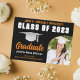 This modern orange and black custom senior graduation party invitation and graduate announcement features classy white typography of your college name for the class of 2025. Customize with your graduating year under the chic black handwritten script and black grad cap for great cards. Add your party details on the back.