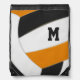 This team colors volleyball drawstring backpack for a boy or girl features the realistic image of an abstractly oversized volleyball with black, orange and white panels, upon which you can customize the athlete's monogram or jersey number - by katz_d_zynes