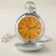 This pocket watch design features a pattern consisting of orange blob-like or splotch-like shapes. It also features rectangles marking the hours, and numbers indicating the hours "12", "3", "6", and "9". [~Z0000088]