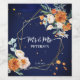 Orange and white roses sage eucalyptus greenery navy blue background gold geometrical frame floral Mr & Mrs personalized name wedding wine labels.