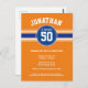 Royal Blue Stripes and an orange background highlight this sport themed birthday party invitation. The design includes a sports jersey design with an area to highlight the Birthday Boy's Name and Age.