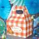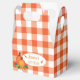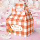 A set of favor boxes with a classic orange and white buffalo check design and two pumpkins . Ideal for any fall event you might be organizing such as baby showers , birthdays , a group event , a Halloween party , a Thanksgiving gathering , a retirement celebration and so much more . Replace the text with your own .