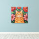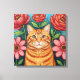 Metal art with a cute orange cat with folk art red and pink flowers.