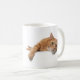 Portrait of an orange tabby cat domestic shorthair laying down on a white background with paw draped over a table