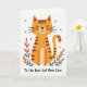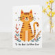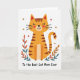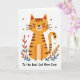 This card features a stylized orange cat centered on a white background, giving off a cozy, affectionate feel with its closed eyes and soft smile ❤️. Dark brown stripes run across its body, forehead, and curled tail, adding a sweet pattern that feels like a gentle hug in picture form. The face includes tiny lashes, rosy cheeks, a small black nose, and thin black whiskers that make the expression look calm and fond. Its upright ears have red inner details, as if the cat is leaning in with friendly attention. Around the lower edge, leafy shapes in deep red-orange and muted teal frame the cat like a little garden nook, with small flower shapes drifting nearby 🌼. Near the bottom, the phrase “To the Best Cat Mom Ever” appears in thick, hand-lettered text in a dark tone that stands out clearly against the white space. The words sit centered beneath the illustration, leaving plenty of open room above so the cat remains the main focus. A few tiny floral accents float around the cat while the curled tail arcs to one side with dark stripes.