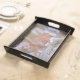 This is a well made, sturdy wooden tray with a flawless black finish and lovely map on the tray surface. It is both vintage & modern at the same time. Looks exactly like the photo; does not disappoint. So nice to find something of quality individually made and not the mass-produced 'shabby chic' merchandise seen in stores. I am so pleased to be able to give this to my college-age niece for her birthday. This can be used as a tray to hold jewelry or toiletries, or hung on the wall as art. The map surface is sealed (it is slightly shiny) so would be moisture resistant. It is well worth the asking price but I was able to apply a sale code as well. Very happy with my purchase. Map is crisp & clear and sealed with a water-resitant finish.