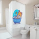 Colorful cartoon graphic of a happy orange cat taking a bubble bath in a blue bathtub with his yellow rubber duck | for white background