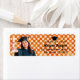 Personalized portrait return address labels for a graduation with an orange checkered pattern on the background and the class, the graduate's name, and an editable address. To create a cut-out, crop your image to the desired subject and use the "remove background" tool.