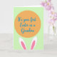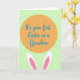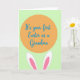 This card features a light spring-green background with a large warm orange circle centered like a spotlight. Inside the circle, a short celebratory message appears in flowing blue lettering, centered and easy to spot. Peeking up from the bottom edge are two long bunny ears 🐰, drawn in white with soft pink inner details, as if a shy friend is leaning in to share the moment. The gentle curves and close placement of the ears beneath the words create a tender, affectionate feel, like a quiet nudge of support. The orange, green, blue, and pink palette keeps the scene light and cozy, with a fresh seasonal look 🌷. The message stays contained within the orange circle, while the ears overlap the lower edge to add depth and a little surprise. The ears sit symmetrically under the circle, with rounded tips and pale pink centers framed by bright white outlines.