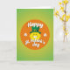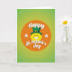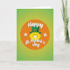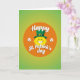 This greeting card features a sunny yellow, emoji-like face with a wide white grin that feels like it’s beaming at someone special across the room 💚. A classic emerald-green leprechaun top hat sits at a jaunty angle on top, finished with a shiny gold buckle that catches the light. The face is centered inside a bright orange circle, like a warm spotlight that draws you in. Behind it, the background shifts through green tones from light lime to deeper forest shades, giving the scene a fresh St. Patrick’s Day look ☘️. Two white shamrocks sit to the left and right of the face, balancing the layout like friendly little accents. The words “Happy St. Patrick’s day” appear across the orange circle in white lettering with a soft shadow, making the text stand out without crowding the artwork. The tilted hat and the big smile suggest a flirty, friendly greeting, like a cheerful wink shared between close friends. The orange circle glows against the green gradient while the white shamrocks frame the center on both sides.