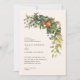 Orange citrus blue watercolor floral and foliage wedding invitation card. Beautiful handprinted floral watercolors and modern script text. Modern on trend design