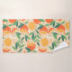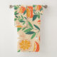 Patterned towel set with a retro vibe. A pattern composed of sliced oranges, whole oranges, green leaves and white blossoms.
