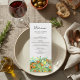 Elevate your reception table with this Italian-inspired wedding menu, featuring a hand-painted abstract orange grove and foliage in warm citrus hues. The watercolor artwork brings a fresh Mediterranean glow to each place setting, beautifully paired with modern handwriting script accents for a refined, romantic touch. The coordinating antique Italian tile pattern on the back adds Old World charm, making this menu a perfect fit for Amalfi Coast celebrations, Italian destination weddings, or any event inspired by sunlit orchards and la dolce vita. Artwork by KL Stock.