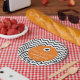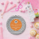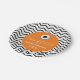 This graduation plate features trendy black zigzag pattern for the background accented with an orange circle in the center. Popular hand lettered style text reads: Class of 2017 with custom text for the name of the graduating senior and their school. A graduation hat above the text adds a small accent to the fun grad party plate. The orange circle color is custom and can be changed to any available color by choosing the customize it button.