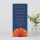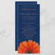 You can personalize all the text on these orange gerbera daisy (gerber daisy) flower, navy blue background personalized affordable wedding programs. The design features a bright and cheerful orange daisy on a navy blue background background. Simple and elegant floral design. NOTE: This is a flat printed design without any raised or 3D embellishments. To change the text, use the personalize options. Or, for more extensive changes (font, font size, font color, text placement), choose customize it. You can even change the navy blue background color is you want. This is a great inexpensive wedding program for a wedding in the spring, summer or fall / autumn or a wedding with an orange gerbera daisy flower theme.