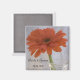 Customize the pretty Orange Daisy Wedding Square Magnet with the personal names of the bride and groom and specific marriage ceremony date to create a personalized keepsake gift, party favor or save the date. This elegant custom flowery wedding magnet features a floral photograph of an orange gerber daisy flower blossom on the stem in a glass vase.