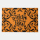 This door mat design features bats and a spider dangling from a the words "Trick or Treat" surrounded by a damask pattern on a orange background.
