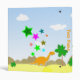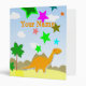 Orange Dinosaur Binder. A cool binder with a cute happy little orange cartoon dinosaur in a pre-historic stone age landscape with palm trees, mountains and valcanos with color stars agains a pretty blue sky with white clouds. Personalize your unique binder with your name on the front & spine to make it very special! A great binder to put in your drawings at home or homework from school. A beautiful back to school dinosaur gift to the big little dinosaur fan!